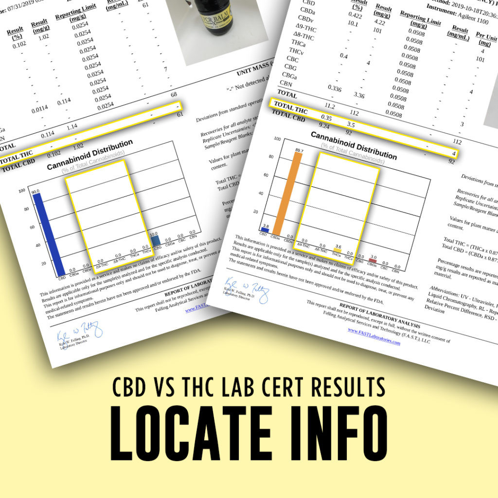 Below is a quick slideshow to help you locate and determine whether your CBD rich product contains THC. THC stands for tetrahydrocannabinol, which is the most well-known ingredient in cannabis. THC is what gives you the psychoactive feeling or the feeling of being high.